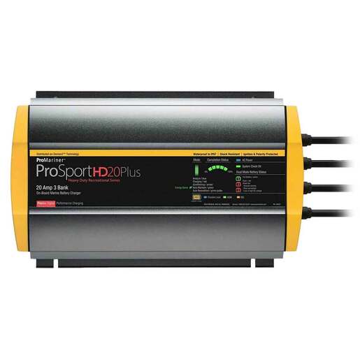 ProMariner ProSportHD 20 Plus Battery Charger - The ProSportHD features a lightweight, tri-surface heatsink design. This delivers significantly faster charging through optimal cooling, while delivering true rated constant current charging amps during charge mode. Fully automatic multi-stage charging enhances battery performance while extending battery life. ProMariner Digital Technology Distributed-On-Demand™ Technology Heavy Duty Tri-Surface Extruded Heat Sink Design Expanded LED Display with Completion Status Gauge Lightweight Design Auto-Maintain Energy Saver Mode Fully Automatic 5-Stage Digital Performance Charging Built-in Quality and Safety Easy Installation and Operation