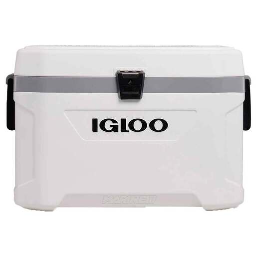 Igloo Ultra 54 Quart Cooler - Trusted by marine enthusiasts since 1967, the Marine cooler collection is built with the essential features for life on/near the water. You can depend on this ideal-sized Marine Ultra ice chest — as an avid fisher, an occasional boater or someone who frequents the outdoors with family and friends — to keep your catch or your provisions chilled. Igloo included thoughtful details to make life easier, like UV protection, grippy handles (even in wet conditions), rust-resistant hardware, drain plug, cup holders, etc. Features: Made in the USA Medium size is great for all-day adventures THERMECOOL foam — a cleaner, eco-friendly insulation — in body & lid provides superior ice retention performance Hybrid latch with a stainless steel hinge provides added durability & a secure lid closure Stainless steel, rust-resistant screws withstand wet, sunny & salty conditions Non-slip, comfort-grip swing-up handles for easy unloading & loading in wet conditions Four self-draining cup holders in the lid keep your drinks secure & within reach Molded-in fish ruler on lid lets you measure your catch instantly Recessed, triple-snap drain plug allows for easy draining of melted ice UV inhibitors protect the cooler exterior from sun damage Stain & odor-resistant liner Put the size into perspective: Holds 76 cans