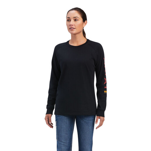 Ariat Women's Rebar CottonStrong Long Sleeve Shirt - Rebar CottonStrong shirts feature ultra-comfortable yet equally durable cotton jersey that is pre-washed to prevent shrinkage. A ribbed collar, droptail hem and screenprint neck label make it a perfect everyday go-to work T-shirt. Greater arn mobility seam construction Preshrunk 6oz durable jersey Relaxed fit Screen printed logo Ribbed collar and cuffs Raglan construction Drop tail hem