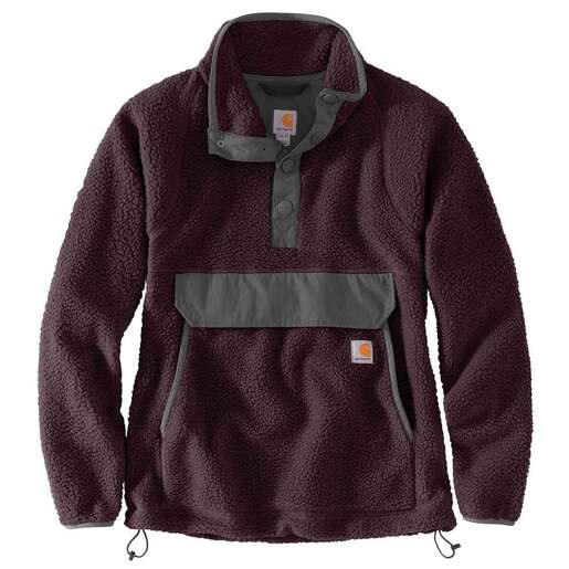 Carhartt Women's Relaxed Fit Fleece Snap Sweatshirt - This women's warm fleece layer works well in your every day attire and for those short hikes on the weekends. Quarter-snap front closure Elastic cuffs for a snug feel Reinforced lower-front pocket with hook-and-loop storm flap Carhartt patch on pocket Droptail hem for added coverage 100% polyester fleece 241g Style: 104922