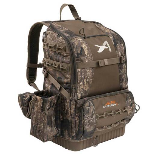 ALPS Outdoorz Vault Blind Bag - Realtree Timber - ALPS Products are designed, built, and tested with a steadfast devotion to quality and performance, and the Vault Blind Bag hits ALPS innovational sweet spot. Day in and day out, faithfully depend on the Vault to comfortably haul a horde of waterfowl gear afield. Confidently secure your gear with the stowaway tree straps, that offer 62in of length to reach around most trees. The oversized, padded waist belt affords high-quality comfort, and acts as a secondary tree anchor reaching 66in. Rely on the cleverly designed internal shelf to quickly access in-hunt items, and stow unused gear or extra shells below when the shelf is deployed. The oversized hold-open shell pocket will easily hold 2+ boxes of live or empty shells. Brave the elements and tame the thickest brush with our rugged 600D external fabric and structured interior. Ideal for timber and blind hunting •Full access, U-shaped lid provides extra-large, flip-down access with a heavy duty #10 zipper •13" x 8.5" fold-down internal shelf can be secured to separate the main compartment and double as a work shelf during the hunt •Two 24" tree straps are hidden in the side panels and reach around most trees •Multiple stake pockets accompanied with adjustable compression straps •22 reinforced MOLLE gear loops •Oversized hold-open shell pocket easily holds 2+ boxes of shells •Hard, weatherproof bottom •Multiple zippered and elastic internal storage pockets are perfect for motorized decoy wings and accessories •Spacious, felt-lined valuables pocket •Padded shoulder straps and oversized waist belt •Drop-down gun boot •Oversized thermos pocket