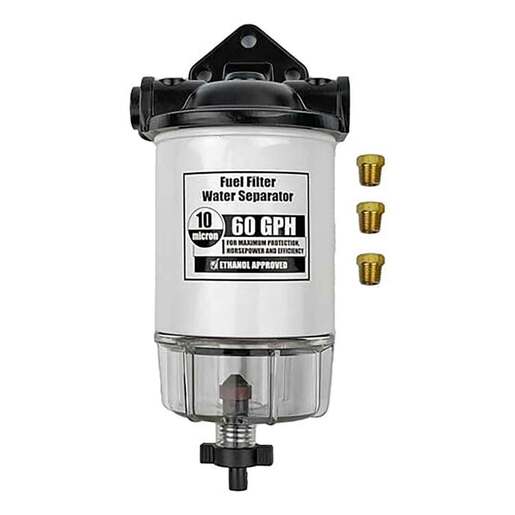 T-H Marine Drainable Fuel Filter/Water Separator Kit - TH Marine DrainableEasy-to-use Drainable Fuel Filter and Separator Kit includes filter, drainable clear bowl, mounting bracket and three NPT brass plugs. Quick spin-on design allows you to easily swap our fuel filters for replacements. Drainable Fuel Filter and Separator Kit features two in-flow ports or fuel tank lines and two out-flow ports for engine lines (use plugs provided for unused ports). Requires 1/4in NPT fitting with hose barb to attach fuel lines. Kit is compatible with 2-cycle and 4-cycle engines. Kit includes filter, drainable clear bowl, mounting bracket and 3 (1/4in) NPT brass plugs 10 Micron filter 60 GPH Ethanol Approved NOT for use with Diesel Clear drainable bowl for removing water
