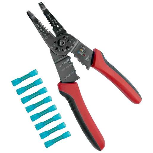 T-H Marine Heat-Shrink Connectors and 6-in-1 Wiring Tool Kit - Wire Terminal Crimper with Heat Shrink Butt Connectors (8) Butt 16-14 Gauge. Features: • Wire stripper 22-10 gauge (AWG) • Connector crimper 22-10 gauge (AWG) • Wire cutter • Plier tip • Machine screw cutter • (8) Butt connectors fits 16-14 gauge (AWG) wire • Wire loop