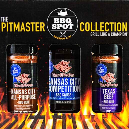 Three Little Pigs Championship Pitmaster Collection BBQ Gift Pack - Products developed by 9x BBQ World Champion, Chris Marks. Want to take your backyard grill game to legendary status? BBQ Spot's Pitmaster Collection was developed to provide you with a sizzling assortment of championship flavors to help make you the cookout king of the cul-de-sac! Features Three Little Pigs BBQ All-Purpose Rub (6.5 oz / 184 g) Three Little Pigs BBQ Kansas City Competition BBQ Sauce (20.3 oz / 575 g) Three Little Pigs BBQ Texas Beef Rub (6.6 oz. /187 g)