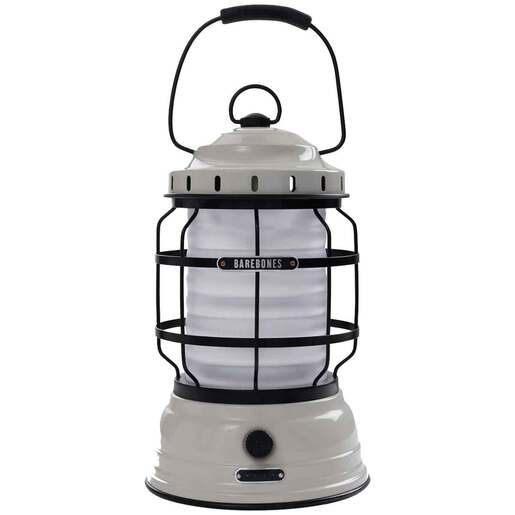 Barebones Forest Lantern - Our beloved vintage-inspired lantern creates a seamless, warm ambiance whether you're camping in the wild or entertaining in the backyard and beyond. Functionality meets classic design with simple on/off push button which also acts as a dimmer, rechargeable micro USB, and durable stamped steel exterior. Set the mood, and sink into your outdoor experience freed from distractions. Features: Warm ambient LED light 4-80+ hours run time, depending on setting Rechargeable Li-Ion battery via micro USB Recharge time 4-6 hrs Available in Antique Bronze, Red, and Vintage White Replacement Battery