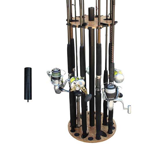 Rush Creek Creations American Cherry Round 24 Rod Rack - Who doesn’t like free stuff and No Tool assembly? Rush Creek Creations are going to give you a free 6in extension post when you purchase this high quality 24 Round Durable Fishing Rod Floor Storage Rack (rods not included). What does the extension post actually do? Most standard floor racks are 30in in overall height and are made for freshwater rod and reel combos. By adding the free 6in extension post along with the innovative dual rod clip technology, you can store those larger saltwater rods vertically on this fishing rod rack. The caps on the base plate capture any water from the rod or reels, the center post is 38mm (1.5in) in diameter and has been powder coated for long-lasting durability and resistant to scratching. The American Cherry wood grain laminate finish only adds to the luster to this superior rod storage rod rack. Assembled rod rack size is 14.75in x 14.75in x 36.375in INNOVATIVE DUAL ROD CLIPS: Holds 2 freshwater rod and reel combos or 1 oversized rod up to 1. 25in diameter 1.5in diameter two-piece steel with 6in extension center post Waterproof handle guides on base plate 4 base leveling supports American Cherry laminate