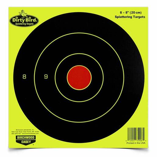 Birchwood Casey Dirty Bird 8in Bullseye Targets - 50 Pack - This 8in bull's-eye target is great for mid-range to close distance target practice. With Dirty Bird splattering performance, it is compatible with a wide range of calibers.