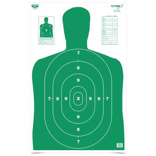 Birchwood Casey EZE-Scorer 23x35in BC-27 Green Silhouette Target - 100 Pack - Great for indoor and outdoor ranges. This target features a high contrast green silhouette, scoring table for recording hits and values, and a score card that is printed on target.