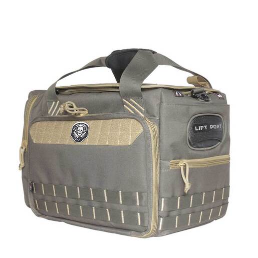 GPS M/L Range Bag - Rifle Green/Khaki - The M/L Range Bag features a n attached interior foam cradle which holds up to 5 medium frame handguns. It utilizes lift ports on each end for easy maneuvering. This range bag also has a visual ID storage system, special pockets for your shooting glasses/magazines/tools, lockable heavy-duty zippers, and an extra magazine storage in its front pocket. Included is a rain cover.