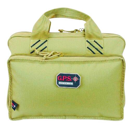 GPS Quad Pistol Range Bag - Tan - The Quad Pistol Range Bag can carry up to four (4) pistol in a think, highly protective quilted tricot lined pockets. Its side pockets lay flat when open and are designed to store magazines, cleaning supplies, tools, spare ammo, and ammo dump cups. This range bag also has a visual ID storage system, lockable heavy-duty zippers, and specialized velour lined pockets for shooting glasses and ear protection.