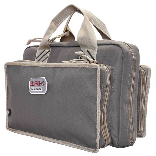 GPS Quad Pistol Range Bag - Rifle Green/Khaki - The Quad Pistol Range Bag can carry up to four (4) pistol in a think, highly protective quilted tricot lined pockets. Its side pockets lay flat when open and are designed to store magazines, cleaning supplies, tools, spare ammo, and ammo dump cups. This range bag also has a visual ID storage system, lockable heavy-duty zippers, and specialized velour lined pockets for shooting glasses and ear protection.