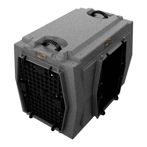 Ruff Land Intermediate Double Door Dog Kennel - The Intermediate Dog kennel was the first dog kennel Ruff Land manufactured. Designed by outdoorsmen, endorsed by celebrities, this intermediate dog kennel sets the standard for built-to-last intermediate sized dog kennels. Vent hole pattern displayed in each photo comes standard kennel (1 3/8in hole size), with two finger holes in the back. The intermediate dog kennel can be stacked and customized with the add-on options. Double Doors: Front and Right side Exterior Size: 30.5in x 20in x 23.25in Interior Size: 30in x 19.5in x 22in Floor Size: 28.5in x 17.5in Weight: Approx. 20lbs Ruff FLEX Technology StackRight Design SureVent Tapered Wall Design UpSide Raised Floor Interior No Bite Grid Pattern Design Rattle-Free