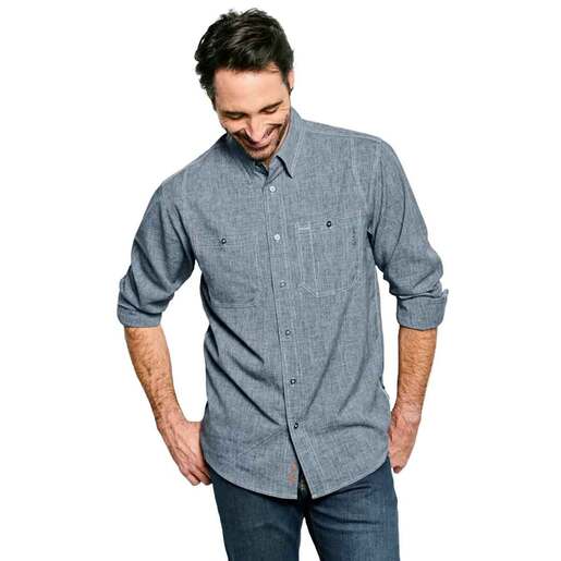 Orvis Men's Tech Chambray Long Sleeve Work Shirt - Technical performance with casual style, this shirt features an easy stretch, quick-dry fabric styled like an authentic chambray work shirt. Enhanced thermal regulation keeps you cool and comfortable Improved stretch and mobility Treated with OutSmart Fresh for odor control and less need to launder 40 UPF sun protection Button-through chest pockets and a pencil hole in the left pocket to hold sunglasses Hidden button-down collar and airholes at the underarms Sunglasses cleaner in the hem 50/50 blend of recycled polyester and polyester MarinoWul+ is an incredibly soft, moisture-wicking, breathable fiber made from recycled plastic bottles and reclaimed oyster shells. 5-7 plastic bottles are recycled for each shirt Style: 18Z96151