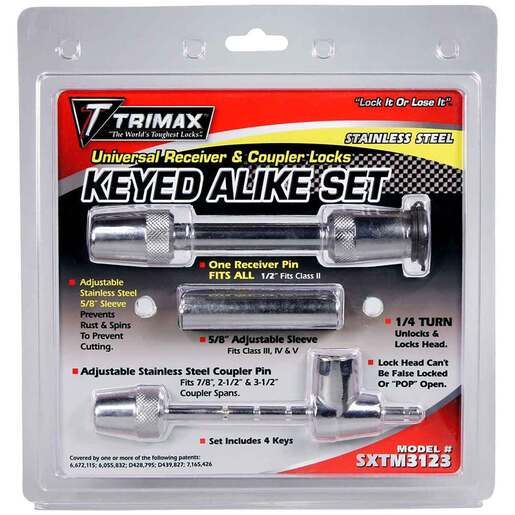 Trimax Stainless Steel Universal Keyed Alike Receivers and Coupler Lock Set - This set will help you lock up your hitch so someone doesn't take what you have attached to your hitch. Set Includes SXTS32 (1/2in x 5/8in Span – 100% Stainless Steel Universal Receiver Lock & Sleeve) SXTC123 (Stainless Steel Adjustable Coupler Lock, 7/8in, 2-1/2in To 3-1/2in Spans)