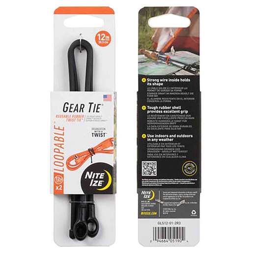 Nite Ize 12in Gear Tie Loopable Twist Tie - 2 Pack - By combining a strong bendable wire interior and durable grippy rubber exterior, the Gear Tie Loopable is perfect for organizing, cinching, and securing almost anything. The added feature of an integrated loop on one end allows you to thread the other end through it and pull to cinch and organize nearly anything, then twist the other end around a handle or anchor point. You can also use the loop to hang it from a small hook or tie a line through the hole for quick connections. Use the 12in to grip, wrap, and secure most small to medium sized items like power cords, tools, and camping equipment, the 18in for bundling yoga mats and hanging bird feeders, and the 24in for large items like hoses, tarps, and outdoor gear. Designed to last, these Gear Ties make organization a cinch. Perfect for keeping your gear accessible and organized Loop, cinch, twist, and store almost anything Integrated loop allows you to cinch Gear Tie around nearly any object Attach it nearly anywhere to keep your gear right at hand Tough rubber shell provides excellent grip Won't scratch or mark Strong internal wire holds its shape Quick and easy to attach and detach Waterproof and UV resistant for indoor and outdoor use Twist it, tie it, reuse it! Made in the USA
