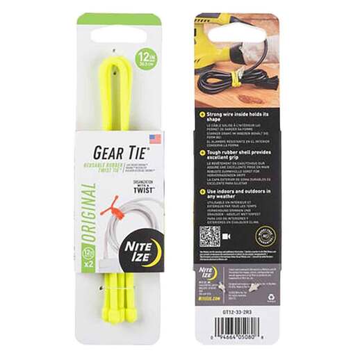 Nite Ize 12in Gear Tie Rubber Twist Tie - 2 Pack - Meet the Gear Tie Reusable Rubber Twist Tie: The ultimate organizer, with a twist. Featuring a strong bendable wire interior for forming around objects and a grippy rubber exterior for staying securely attached, the Gear Tie can bundle, secure, and hang gear with a simple wrap-and-twist motion. Waterproof, UV-resistant, flexible, and made in the USA, you’ll find yourself reaching for Gear Ties around the house, in the backyard, on camping trips, and everywhere in between. Twist it, tie it, and reuse it for years to come. Use the 3in to keep computer cords, headphones and ear buds bundled and untangled, close produce and snack bags, shore up plant and flower stems and much, much more. The 6in Gear Tie is the perfect solution for containing and organizing medium to long cords and cables, hair dryers, kitchen appliances, and all those other electronic items you need every day. The 12in Gear Tie can bundle, connect, and organize everything from workshop tools to children's toys, appliance cords, and more. The 18in is the perfect size to wrap and organize medium-to-large items such as jumper cables and extension cords, as well as hanging lightweight tools and lanterns. The 24in Nite Ize Gear Tie is a great organizer for bigger unwieldy items such as yoga mats, skis and skates, and larger tools, and is tough enough to hang a heavy lantern or full can of paint from a ladder. The 32in Gear Tie bundles garden tools, hoses, and industrial appliance cords and is a great companion on camping/fishing/hiking trips for wrapping sleeping bags, hanging waders, and more. 64in Gear Ties make light work of big jobs, from securing lightweight loads to roof racks, wrapping uneven bundles, attaching bags to rolling luggage/carts, stabilizing tall loads to dollies, and anchoring larger items like propane tanks in truck beds. Tough rubber shell provides excellent grip Strong wire inside holds its shape Made in the USA Twist it, tie it, reuse it Thousands of uses at the home, on trips, on the boat, and beyond Waterproof and safe for use in fresh or salt water without damage UV resistant - will not be damaged or destroyed by extended sun exposure Won’t scratch or mark Use indoors and outdoors in any weather