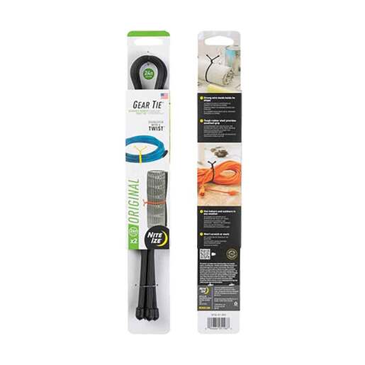 Nite Ize 24in Gear Tie Rubber Twist Tie - 2 Pack - Meet the Gear Tie Rubber Twist Tie: The ultimate organizer, with a twist. Featuring a strong bendable wire interior for forming around objects and a grippy rubber exterior for staying securely attached, the Gear Tie can bundle, secure, and hang gear with a simple wrap-and-twist motion. Waterproof, UV-resistant, flexible, and made in the USA, you’ll find yourself reaching for Gear Ties around the house, in the backyard, on camping trips, and everywhere in between. Twist it, tie it, and reuse it for years to come. Use the 3in to keep computer cords, headphones and ear buds bundled and untangled, close produce and snack bags, shore up plant and flower stems and much, much more. The 6in Gear Tie is the perfect solution for containing and organizing medium to long cords and cables, hair dryers, kitchen appliances, and all those other electronic items you need every day. The 12in Gear Tie can bundle, connect, and organize everything from workshop tools to children's toys, appliance cords, and more. The 18in is the perfect size to wrap and organize medium-to-large items such as jumper cables and extension cords, as well as hanging lightweight tools and lanterns. The 24in Nite Ize Gear Tie is a great organizer for bigger unwieldy items such as yoga mats, skis and skates, and larger tools, and is tough enough to hang a heavy lantern or full can of paint from a ladder. The 32in Gear Tie bundles garden tools, hoses, and industrial appliance cords and is a great companion on camping/fishing/hiking trips for wrapping sleeping bags, hanging waders, and more. 64in Gear Ties make light work of big jobs, from securing lightweight loads to roof racks, wrapping uneven bundles, attaching bags to rolling luggage/carts, stabilizing tall loads to dollies, and anchoring larger items like propane tanks in truck beds. Tough rubber shell provides excellent grip Strong wire inside holds its shape Made in the USA Twist it, tie it, reuse it Thousands of uses at the home, on trips, on the boat, and beyond Waterproof and safe for use in fresh or salt water without damage UV resistant - will not be damaged or destroyed by extended sun exposure Won’t scratch or mark Use indoors and outdoors in any weather