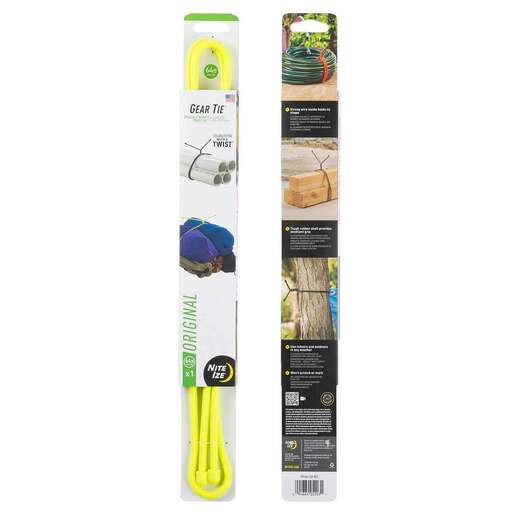 Nite Ize 64in Gear Tie Rubber Twist Tie - 2 Pack - Meet the Gear Tie Reusable Rubber Twist Tie: The ultimate organizer, with a twist. Featuring a strong bendable wire interior for forming around objects and a grippy rubber exterior for staying securely attached, the Gear Tie can bundle, secure, and hang gear with a simple wrap-and-twist motion. Waterproof, UV-resistant, flexible, and made in the USA, you’ll find yourself reaching for Gear Ties around the house, in the backyard, on camping trips, and everywhere in between. Twist it, tie it, and reuse it for years to come. Use the 3in to keep computer cords, headphones and ear buds bundled and untangled, close produce and snack bags, shore up plant and flower stems and much, much more. The 6in Gear Tie is the perfect solution for containing and organizing medium to long cords and cables, hair dryers, kitchen appliances, and all those other electronic items you need every day. The 12in Gear Tie can bundle, connect, and organize everything from workshop tools to children's toys, appliance cords, and more. The 18in is the perfect size to wrap and organize medium-to-large items such as jumper cables and extension cords, as well as hanging lightweight tools and lanterns. The 24in Nite Ize Gear Tie is a great organizer for bigger unwieldy items such as yoga mats, skis and skates, and larger tools, and is tough enough to hang a heavy lantern or full can of paint from a ladder. The 32in Gear Tie bundles garden tools, hoses, and industrial appliance cords and is a great companion on camping/fishing/hiking trips for wrapping sleeping bags, hanging waders, and more. 64in Gear Ties make light work of big jobs, from securing lightweight loads to roof racks, wrapping uneven bundles, attaching bags to rolling luggage/carts, stabilizing tall loads to dollies, and anchoring larger items like propane tanks in truck beds. Tough rubber shell provides excellent grip Strong wire inside holds its shape Made in the USA Twist it, tie it, reuse it Thousands of uses at the home, on trips, on the boat, and beyond Waterproof and safe for use in fresh or salt water without damage UV resistant - will not be damaged or destroyed by extended sun exposure Won’t scratch or mark Use indoors and outdoors in any weather