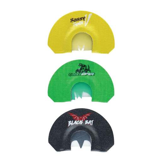 Phelps Raspy Diaphragm Turkey Call - 3 Pack - If you like your hen to sound like the Ol' Boss Hen these will have all the rasp you need. Sassy Split-V: The sassy split V is a 3 reed call with a shortened V-cut. The shorter cut gives a sharper/crisper raspy tone which is perfect in producing those loud cutts and yelps of a mature hen turkey. Green Viper: The Green Viper call is a 3 reed call with a snake tongue combo cut which makes it great for producing; raspy yelps, hard cutts, and kee kees, as well as being soft enough on the off side of the snake tongue to produce soft clucks and purrs. Black Bat: The Black Bat diaphragm call features an easy to control batwing cut. This call produces medium rasp yelps when played to either side. When played down the middle the rasp picks up and the call can mimic an older hen.