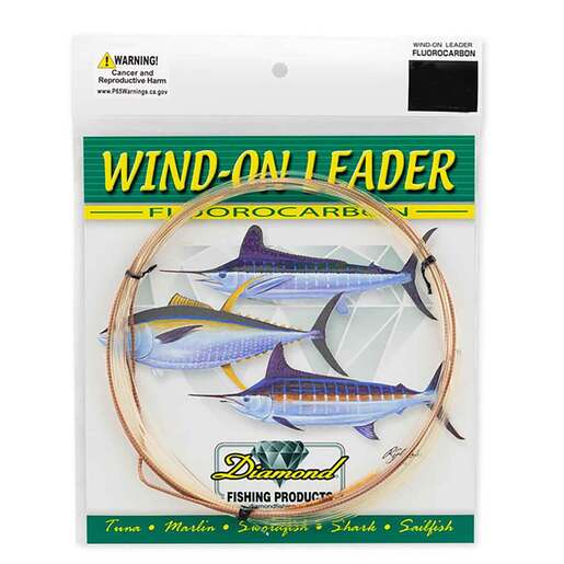 Diamond Fishing Products Wind-On Fluorocarbon Leader - Diamond’s high strength monofilament and fluorocarbon combined with a low stretch dyneema loop creates the strongest, most dependable wind-on leader in the world. Diamond’s Wind-On leaders are attached with a loop to loop connection to your fishing line. The wind-on system improves bait presentation, eliminates the need for conventional long leaders and provides safer handling and releasing of fish at the boat.