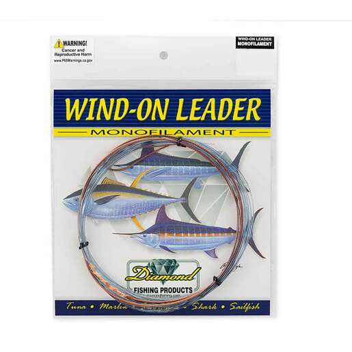 Diamond Fishing Products Wind-On Monofilament Leader - Diamond’s high strength monofilament and fluorocarbon combined with a low stretch dyneema loop creates the strongest, most dependable wind-on leader in the world. Diamond’s Wind-On leaders are attached with a loop to loop connection to your fishing line. The wind-on system improves bait presentation, eliminates the need for conventional long leaders and provides safer handling and releasing of fish at the boat.