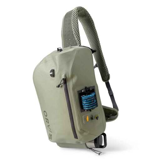 Orvis Pro Waterproof Fishing Sling - Discover the next generation of fishing bag design in our PRO Waterproof Sling 14L. 14L of ample storage and sling-style comfort Made from 840-denier, abrasion- and puncture-resistant ballistic nylon Coated with .1mm waterproof TPU on both sides Submersible, blow-out free, #10 TIZIP MasterSeal zipper Includes patented, easy-access Tippet Whippet Generous opening dimensions for easy access Perforated, 10mm foam padding in shoulder strap and back panel Integrated back panel net scabbard and exterior D-ring Water bottle pocket with retention leash Internal hanging pockets 14L/1830 cu. in.