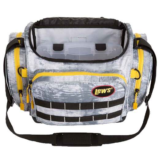Lews Soft Tackle Bag - Tough texture, non-slip, compression molded bottom Adjustable shoulder strap with molded shoulder pad Front pocket organizes fishing gear Coated mesh back pocket Molle equipped