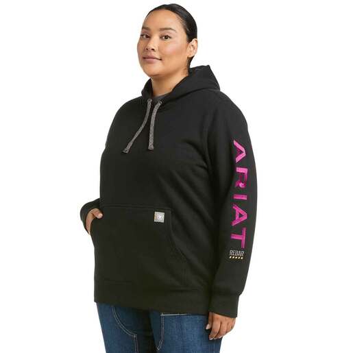 Ariat Women's Rebar Graphic Work Hoodie - Combining warm comfort with functional details, the Rebar Graphic Hoodie is the perfect mid-layer for work and life. 10oz fleece with water-repellent finish Ribbed cuffs and hem Embroidered sleeve logo Hidden security/mobile phone pocket Kangaroo pocket Greater Arm Mobility extends inseams for an optimal range of motion Stain-repellent finish provides protection against stains, dirt, and other marks Style: 10046775