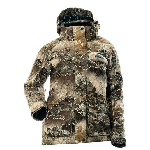 DSG Outerwear Women's Realtree Excape Kylie 4.0 3-in-1 Hunting Jacket - This women's 3-in-1 hunting jacket allows you to adjust for various temperatures by adding or removing layers to suit your specific needs. Quiet brushed waterproof/windproof outer jacket Outer jacket to wear alone or zip in the wearable fleece liner for added warmth DWR treatment to shed water off the fabric 100% fully taped seams Thin profile 100g insulation Adjustable and removable hood Large center front zipper with windflap which has hidden snaps to securely close and keep cold temperatures out Large hand warmer cargo pockets with hidden snap closure flaps and side entry pocket Interior lycra wrist gaiter with thumb hole Color matched liner accompanies shell All liners have DSG logo embroidery on upper chest Zip in feature on shell and liner, along with anchors to secure liner to shell makes this a functioning 3-in-1 jacket Large center front zipper and zipped hand warmer pockets Style: 99816-RTEX