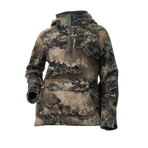 DSG Outerwear Women's Realtree Excape Breanna 2.0 Fleece Hunting Jacket - The ultimate combination of function and comfort, the Breanna fleece camo pullover is made of a quiet, bonded stretch fabric with a soft shearling interior. This fabric is DWR treated to help shed water to keep you warm and comfortable. The Realtree Excape camouflage is used so you can blend into your environment at close range, and from a distance. DWR treatment on face of the fabric to shed water Durable waterproof repellent Removable & adjustable hood Adjustable cuffs Two-way kangaroo pocket with hook & loop closure on top entrance Super soft interior Mid Season Style: 52184
