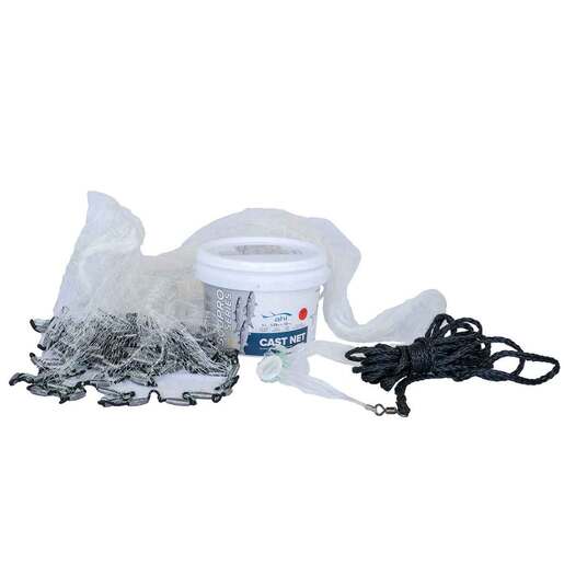 Promar 500 Pro Series Cast Nets - Professional Grade Cast Net for the avid saltwater angler.What sets this series apart is it's 6 panel design and construction that features double knotted 1in Monofilament Square Mesh making it ideal for targeting large baits like Mullet or Large Shad 12in in size or large. Each net also includes our Premium UBE Chip Monofilament Netting, 100 Ibs test braille lines, and 1.25 Ibs of Actual Lead Weight per foot of lead line. Due to its heavier weight and capability of sinking faster, each net comes together at a commercial grade anodized swivel that includes a 30ft poly rope handline. Each net comes packed in a reusable round bucket, helping with storage when the net is not in use and doubles as a chum or bait bucket when you are in the heat of catching bait. Each cast net also comes packed with Step by Step instructions on how to properly load and throw for optimal use.