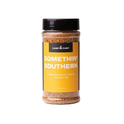 Camp Chef Somethin' Southern Seasoning - This Sweet & Savory Carolina-style Dry Rub throws hints of smoked paprika, brown sugar, sage and thyme giving you a perfect southern blend from anywhere. Features Dual opening Great for BBQ