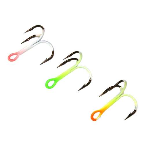 JB Lures Assorted Glow Treble Hook Ice Fishing Lures - A glow treble hook in three colors and 4 different sizes. A great addition to any lure using treble hook, spoon, crankbaits, vertical jigging lures, etc.
