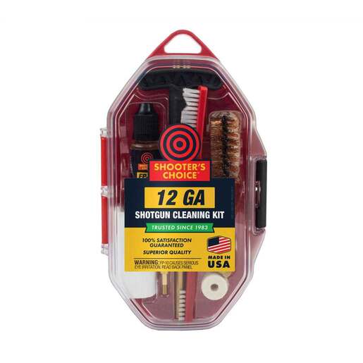 Shooter's Choice 12 Gauge Shotgun Cleaning Kit - Shooter’s Choice 12 Gauge Shotgun Cleaning Kit contains quality brass components that won’t damage your firearm while cleaning. Get everything you need to clean your 12 GA Shotgun in one place with this kit, featuring a unique jag system as well as brushes, mops and patches. Includes 5 brass rod sections. It even includes an all purpose brush to aid in fine cleaning. A bottle of FP-10 Lubricant Elite CLP is included to keep your firearm properly lubricated and operating smoothly. Cleans 12 Gauge shotguns (5) brass rod sections with male/female 8/32 threaded ends and swivel handle rod for easy cleaning 3in 12ga bronze phosphor bore brush 3in 12 GA cotton bore mop 20 count 2.5inx2.5in cleaning patches Nylon All-Purpose cleaning brush 12 GA brass pierce point jag and three felt pads Shotgun 8/32 to 5/16-27 threaded end adaptor 0.5 fl. oz. bottle of FP-10 Lubricant Elite CLP