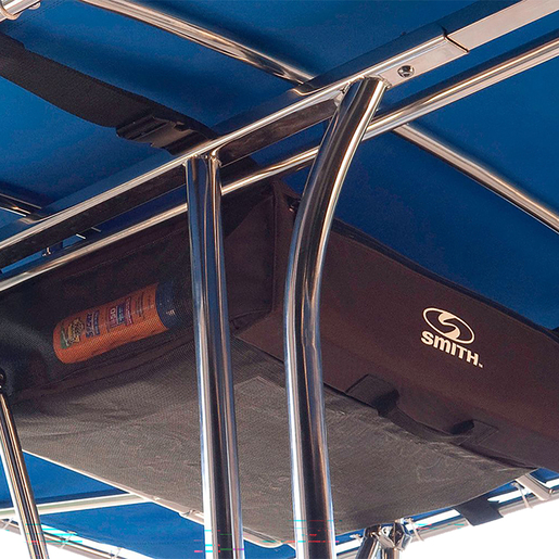 C.E. Smith T-Top Storage Bag - Stores Life Vests and other Boating Essentials. Features: Safe hook and loop closure for instant emergency access to life jackets. Mesh top allows wet gear to dry. 2 mesh side storage pockets, 1 mesh bottom storage pocket and 1 large dry zippered pouch to store phones, wallets, glasses and other valuables. Heavy duty marine grade corrosion resistant zipper Mounts under a T-top with four 2in wide adjustable snap buckle straps. Strong 600 denier polyester construction. 25in x 20in x 6in Main compartment holds 4 standard sized life jackets or other boating gear