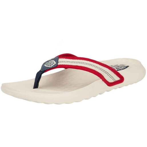 Hey Dude Men's Myers Americana Flip Flops - The Myers Flip Americana is designed to be worn proudly – and securely, too, thanks to a stretch canvas upper that molds to the foot. Add a foamy footbed and flexible outsole, and walk tall. Textile upper molds to foot for snug fit Foam backed upper for added comfort Lightweight outsole DUDEWAVES TECHNOLOGY- footbed texture – enhances comfort and improves underfoot airflow for breathability Soft textile toe post for comfort Flexible outsole Style: 41095