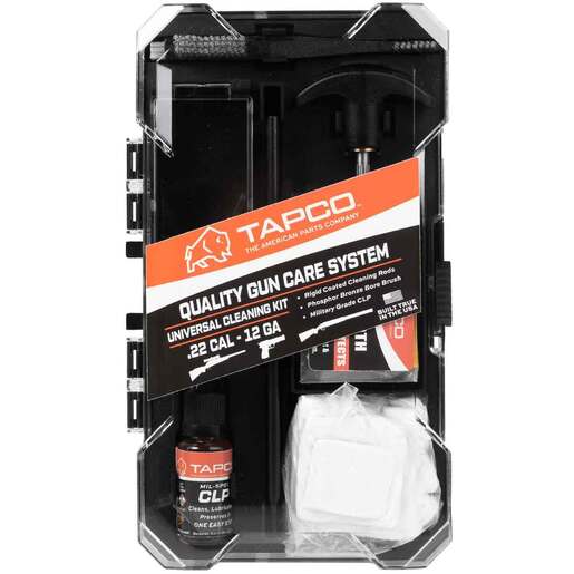 TAPCO Universal Cleaning Kit - The TAPCO Universal Cleaning Kit is good on all handguns, rifle & shotguns. A great item to add to your range bag and gun cabinet. It has the ability to clean an array of firearms from .22 Cal - 12 GA. Includes: Rigid Black Steel Rods, 30in Length with Swivel Handle Rod Accessory Adaptor to accept #8-32 Threads Double End Nylon Bristle Gun Brush Black Steel Patch Holder Aluminum Shotgun Adaptor Slotted Shotgun Patch Holder Muzzle Guard 2oz CLP Silicone Cloth Cotton Cleaning Patches