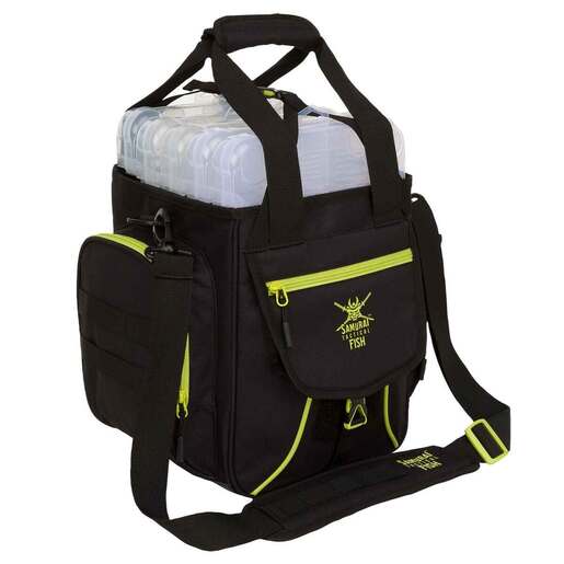 Samurai Tactical Fish Kamapachi Soft Tackle Bag - Elevate your fishing experience with the Samurai Tactical Fish Kamapachi Soft Tackle Bag. Compact yet spacious, this bag boasts 20 liters of volume, with dimensions of 11.1in x 8.8in x 8.6in. Stay organized with its 5 large utility boxes in the main compartment (13.5in x 8.4in x 1.8in), while the coated mesh back pocket and tough grip base offer added functionality. The laser-cut hook and loop panel, hidden stash pocket, and detachable tool holster enhance convenience. Discover angling efficiency and style – invest in this tackle bag for unforgettable fishing excursions.