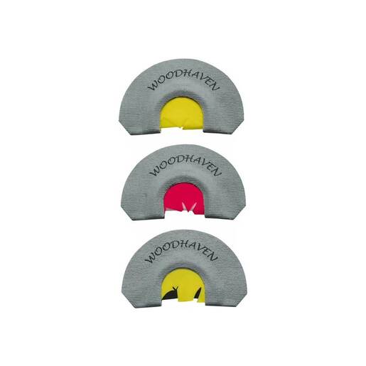 Woodhaven Calls Premier Turkey Diaphragm Call - 3 Pack - Introducing WoodHaven’s Premier 3-pack designed by Mike Pentecost, Scott Ellis, and Billy Yargus. The Premier 3 Pack consists of The Yellow Hammer, The Dagger, and The Equalizer. The “Yellow Hammer”, designed by Mike Pentecost, is the first “hammer’ cut call made of all premium prophylactic reed material. It is a 3 reed “lite” call with the popular hammer cut from Woodhaven The YellowHammer will do it all with very little air and has that signature proph tone that just sounds like a real hen. The Dagger, designed by Scott Ellis, is a three reed, split v /side cut hybrid call. The Dagger consists of a red top reed . 004 over two reeds of natural .003. The Dagger call has the ability to create all turkey sounds loud and soft with minimal effort. The hen is built into the call. Just add air and she comes to life. The Equalizer, designed by Billy Yargus, has a .004 yellow top reed over two reeds of proph and .003 latex. This call is designed to give hunters the ability to get raspy and loud, quiet for those softer tree yelps, and easily makes raspy cutts, cackles, and assembly yelps.