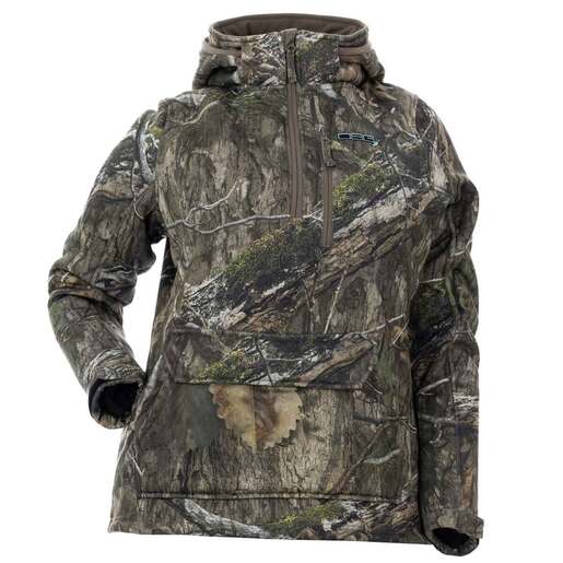 DSG Outerwear Women's Mossy Oak Country DNA Breanna 2.0 Fleece Hunting Jacket - The ultimate combination of function and comfort, this fleece camo pullover is made of a quiet, bonded stretch fabric with a soft shearling interior. DWR treatment on face of the fabric to shed water Removable and adjustable hood Adjustable cuffs 2-way kangaroo pocket with hook and loop closure on top entrance Super soft interior Style: 513314