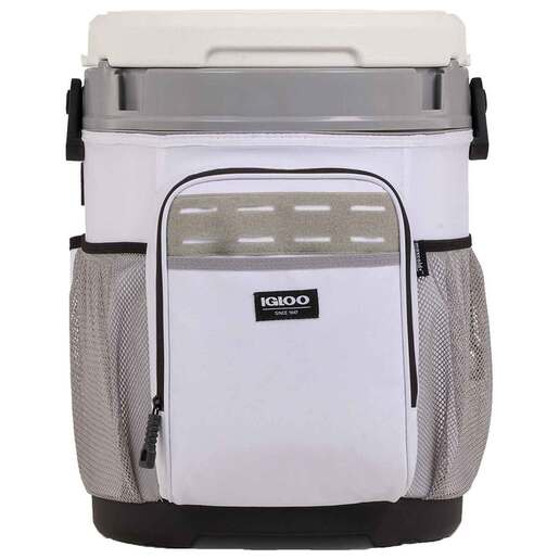Marine 20 Quart Cooler Bucket - Meet your new shoreline buddy. It’s a cooler, a bucket and a seat all wrapped into one. Igloo built this Marine Cooler Bucket with MaxCold Ultra insulation, water-resistant exterior material, sturdy handle (that also locks the lid), tons of organizational pockets and a heavy-duty design that lets you cast your line, crack open a cold one and take a load off. Plus, it has added features to better your day out by the water: food tray, rod holders, MOLLE webbing for attaching essential gear (like rigs, tools, small tackle boxes) and a bottle opener. Features: Heavy-duty hybrid hardside/softside bucket with built-in advanced insulation for keeping refreshments cold Extremely sturdy body & lid doubles as a seat, supporting up to 300 pounds of weight Hard liner with MaxCold Ultra insulated softside exterior provides advanced ice retention Durable, TPE-coated 600D polyester softside sleeve exterior is water- & dirt-resistant & provides ample organization options Removable interior tray/basket keeps food items dry Two built-in fishing rod holders with four position slots to make your day out even easier Built-in utility details: Hero hook-&-loop patch on front pocket, MOLLE webbed loops on straps to attach accessories at the back & heavy-duty detachable bottle opener at the side Foam-insulated blow-molded lid & thick wall injection-molded base & liner protects & stabilizes Sturdy injection-molded bail handle with grooves for a grippier hold & a lid lock feature To lock lid: The handle must be in the vertical carry position or in the forward & down position To unlock lid: The handle must be in the back & down position Extra-large front zipper pocket for keeping items secure & out of sight Front slip pocket for storing smaller, slim accessories An expandable mesh pocket at each side Two roomy & wide backside storage pockets Plenty of vertical space to hold sports drinks & bottles upright Put the 20-quart size into perspective: Holds up to 24 cans