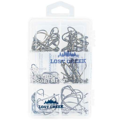 Lost Creek Bass Hook Assortment - 75 Pack Baitholder Hooks, Weedless Hooks, Wide-Gap Bass Hooks, Dropshot Hooks, Wide-Gap Hooks, Beak Hooks all in one convenient clear utility box. Includes: Black Nickel Wide-Gap Bass Hooks: (4) Size #1 (3) Size #1/0 (2) Size #2/0 Black Nickel Dropshot Hooks: (5) Size #1/0 (4) Size #2/0 Black Nickel Wide Gap Hooks: (5) Size #6 (4) Size #4 Bronze Beak Hooks: (7) Size #1 (5) Size #1/0 (5) Size #2/0