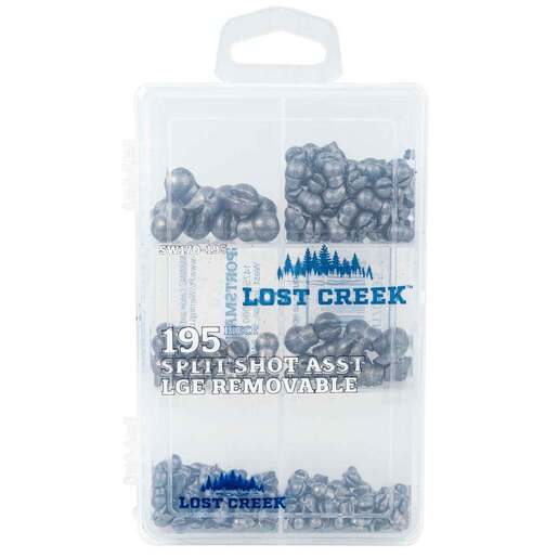 Lost Creek Removable Splitshot Assortment - 195 Pack Achieve the perfect balance and buoyancy. Designed to easily be added and removed from fishing line without damage. Perfect for anglers that adjust their baits or techniques often. Lost Creek now has all the sizes you would need in a reusable clear utility box. Depth Control Includes: Reusable Transparent Utility Box Removable Lead Splitshots: (10) Size #4 (12) Size #5 (16) Size #7 (60) Size #3/0 (97) Size BB