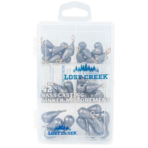 Lost Creek Bass Casting Sinker Assortment - 42 Pack Bass Casting Sinkers in a variety of weight and sizes all in one convenient reusable clear box. Includes: Reusable Transparent Utility Box Lead Casting Sinkers in Sizes: (4) Size #7, 3/8oz (8) Size #8, 1/4oz (12) Size #9, 3/16oz (18) Size #10, 1/8oz