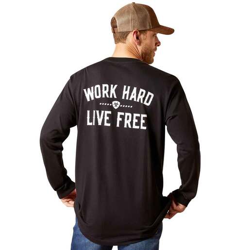 Ariat Men's Rebar Cotton Strong Work Hard Live Free Long Sleeve Work Shirt - Work hard, live free, and wear a T-shirt that keeps up. Core to every Rebar CottonStrong T-shirt is pre-washed, ultra-comfortable yet equally durable jersey fabric. Greater Arm Mobility lets you move freely Long back hem helps keep you covered while you bend and stretch Ribbed crewneck and cuffs Chest pocket with hidden pen/pencil slot Garment is prewashed to help minimize shrinking Style: 10052053