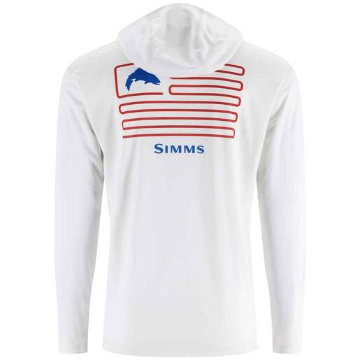 Simms Men's Tech Hooded Long Sleeve Fishing Shirt - Wear your favorite catch and stay ultra-fresh in the Tech Hoody that dials down the heat and cranks the comfort with an easy-breathing, moisture-wicking, sun-blocking fabric formula. Lightweight jersey knit fabric that feels smooth and stretches with each cast Hood built to protect your ears, neck, and back of your head from the sun UPF 30+ 100% polyester with moisture management + antimicrobial 135 gsm Artist series grapfic on the back Style: 13521