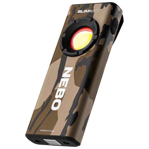 NEBO Slim+ 1200 Rechargeable Pocket Light - The SLIM+ 1200 is a thin, powerful, rechargeable 1,200 lumen pocket light with a red laser pointer and a Power Bank to charge your USB powered devices. Waterproof (IPX7) and equipped with Smart Power Control, the SLIM+ 1200 also features a magnetic pocket clip and powerful magnetic base for convenient hands-free lighting. Features Camo color is Mossy Oak Bottomland USB-C rechargeable Power bank Smart Power Control (SPC) Direct-to-Red Power indicator Battery charging indicator Magnetic clip Anodized aircraft-grade aluminum Waterproof (IPX7) and impact-resistant Powerful magnetic base USB-C to USB charging cable included Operation: Side-positioned button controls power and modes; press and hold while off for laser, press and hold while on for turbo. Recharge time: 2-4 hours, depending on output of USB Light Modes: WORK LIGHT MODES Turbo (1,200 lumens): 30 seconds* / 52 meters High (700 lumens): 1.75 hours / 41 meters Medium (350 lumens): 3 hours / 29 meters Low (30 lumens): 12 hours / 8 meters Strobe (700 lumens): 2 hours / 41 meters Red (8 lumens): 4 hours / 4 meters Red Strobe (8 lumens): 6 hours / 4 meters After 30 seconds, light returns to the previously used mode to prevent overheating and protect the battery. Turbo mode can be reactivated at any time. LASER MODE: Red Laser (