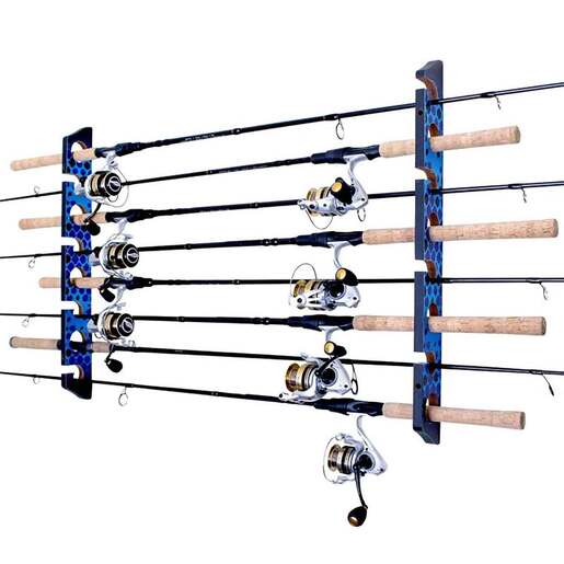 Rush Creek Creations 8 Capacity Wall or Ceiling Rod Rack - This easy-to-assemble rod storage rack can be easily mounted on the wall or ceiling to organize your rods. (rods not included). This is a great space-saving device and will only add longevity to the life of your fishing rods. This product is also available in a 2-pack. The assembled size of this rack is 23.5in x 2.75in x 5in Holds up to 8 rod or reel combos 2-piece construction can be mounted on wall or ceiling for versatility Blue scale grain laminate Deep grooved rod rests Easy to install All hardware included