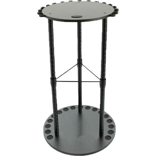 Rush Creek Creations Round Spinning 17 Rod Rack with Tackle Storage - The Rush Creek Creations 17 Spinning Fishing Rod/Pole Storage Utility Box Organizer Floor Rack with Heavy Duty Adjustable Wire Shelf is any anglers dream for organizing all their fishing gear and tackle (rods and utility boxes not included). The base includes the Ultra-Glide Swivel system for a full 360-degree smooth rotation. The 3 tier steel internal leg structure is powder coated for added durability and resists scratching. The wire shelf rests in the middle of the rack and can be adjusted to any height between the base and top plate. This rack is designed to hold a variety of utility boxes in different sizes. You will be able to sort crankbaits, spinners, jigs, plastics and other accessories for a quick “grab ‘n go” to the water. The base plate has caps for rod handles. A high-tech carbon fiber laminate adds to the overall beauty and aesthetics of this rod storage rack. The circular top plate has 17 soft freshwater rod clips that will adjust to any taper. The storage rack was also designed to have easy access to utility boxes. The assembled size of this rack is 17.72in x 17.72in x 32.875in Holds up to 17 rod or reel combos Carbon fiber weave laminate Adjustable wire middle shelf 1in diameter two-piece steel frames for added stability Ultra Glide swivel system on base plate allows for smooth 360 degree rotation Waterproof handle guides on base plate 4 base leveling supports