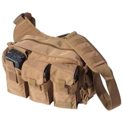 5.11 Bail Out Bag 9 Liter Range Bag - Flat Dark Earth - An always-ready solution for urgent operations, the Bailout Bag has outside pockets made to house 6 standard AR magazine or 3 .308 magazines, plus additional internal and external platforms that are ever need will fit in here. Built from rugged, lightweight, all-weather 1050D nylon, featuring an adjustable quick-release strap, the Bailout Bag will see you through the day's battle. Features Made for Active Shooter Response Teams Three front pockets hold six AR magazines MOLLE/5.11 SlickStick web gear expandability 1050D nylon construction Side utility pockets Adjustable strap with quick-release drop Internal hook and loop closure for pull-out pouches Padded aero-mesh at rear to prevent abrasion Shoulder pad is removable for added speed